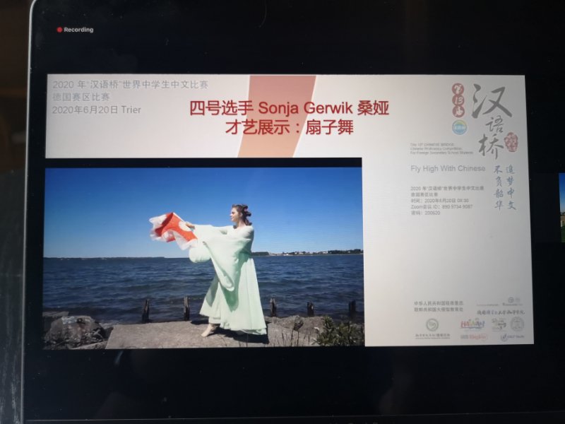 Am 20. Juni deutscher Zeit endete das Deutschlandfinale des 13. Chinesisch-Wettbewerbs Chinese Bridge für Schülerinnen und Schüler im Jahr 2020, das von der chinesischen Botschaft in Deutschland und vom Konfuzius-Institut der Universität Trier veranstaltet wurde. Betroffen von der Corona-Epidemie fand dieser Wettbewerb erstmals digital in Form einer Videokonferenz statt. 13 Schülerinnen und Schüler aus verschiedenen Städten Deutschlands zeigten ihre Liebe zur chinesischen Kultur durch Reden auf Chinesisch, Quiz- und Talentshows zum Thema Chase Chinese Dream, Live Your Youth.