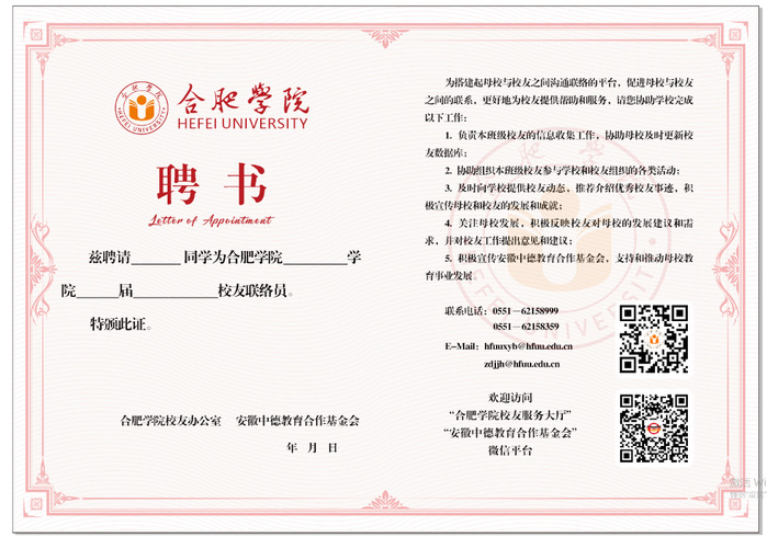 7月8日上午,在合肥学院2021届毕业典礼暨学位授予仪式上,学校为2021届毕业生校友联络员颁发了聘任证书。学校此次共从11个二级学院选聘了84位校友联络员,为母校联系毕业校友奠定了坚实的基础。
