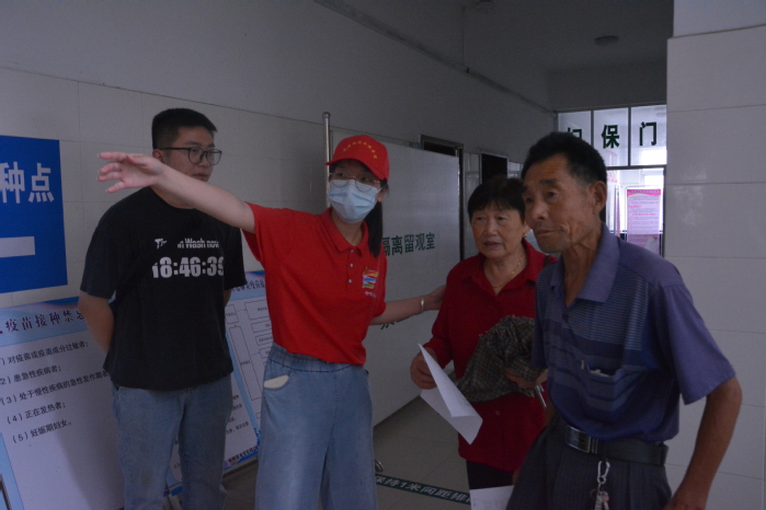 到达柿树岗乡之后,调研团队面对蚊虫叮咬、天气炎热和较为艰苦的住宿环境没有表现出畏难情绪,而是即刻参与到当地医疗卫生工作之中。大家前往当地卫生院,协助医护人员完成疫苗接种工作,帮助维护现场秩序,同时也为当地人民普及基础医疗知识,解答关于疫苗接种问题,消除未接种居民心中的疑惑与担忧。