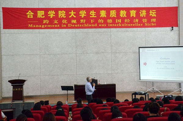 6月25日,图书馆学术报告厅B厅座无虚席,我校荣誉教授、德国奥斯纳布吕克大学经济学系博士生导师汉斯·沃尔夫·奚伟德教授做客大学生素质教育讲坛,国际交流合作处、外国语言系、团委等相关部门负责人和经济系、管理系、外国语言系等系部学生聆听讲座。党委副书记、校长张文兵出席并致欢迎辞。