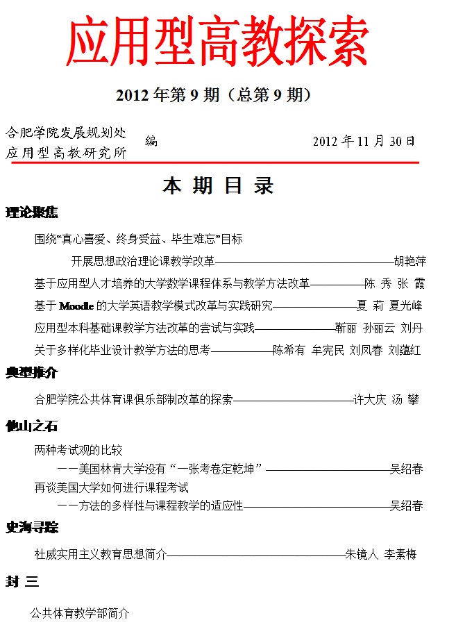 《应用型高教探索》第 9 期以“公共课教学改革和课程考核方式改革”为主题组稿,目录如下,具体内容请查阅发展规划处网站,并将您的宝贵意见或建议反馈至我处。