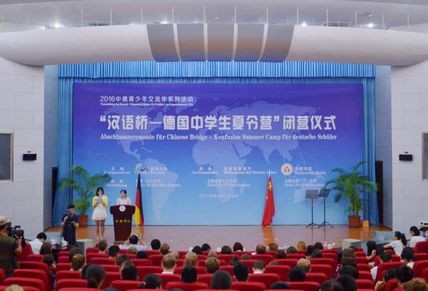 7月27日,2016年“汉语桥——德国中学生夏令营”闭营仪式在合肥学院图书馆学术报告厅举行。安徽省教育厅外事处处长丁育红、德国汉诺威孔子学院院长蔡琳、德国萨克森州文部代表凯思婷·史托伯格等应邀出席。各协办单位代表、“汉语桥-德国中学生夏令营”师生共百余人参加仪式。