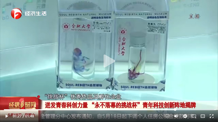 我校2020年在第十二届“挑战杯”中国大学生创业计划竞赛中荣获国赛金奖作品《灵魂重铸——未来新型生物标本领行者》入选安徽创新馆展示,其项目负责人秦家哲在赛后成功孵化企业,创办了新博元晟生物科技有限责任公司。仪式现场,秦家哲在展馆内向来宾展示了项目成果以及发展前景,讲述项目的发展历程、品牌效应等情况。